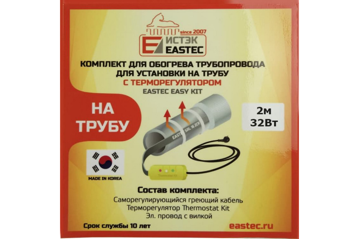 EK-02 EASTEC комплект для обогрева трубопровода(2м-32 Вт) идеально подходит для обогрева водопроводных и канализационных труб, а также систем водоснабжения на открытом воздухе, в неотапливаемых помещениях, на дачах и в загородных домах.​