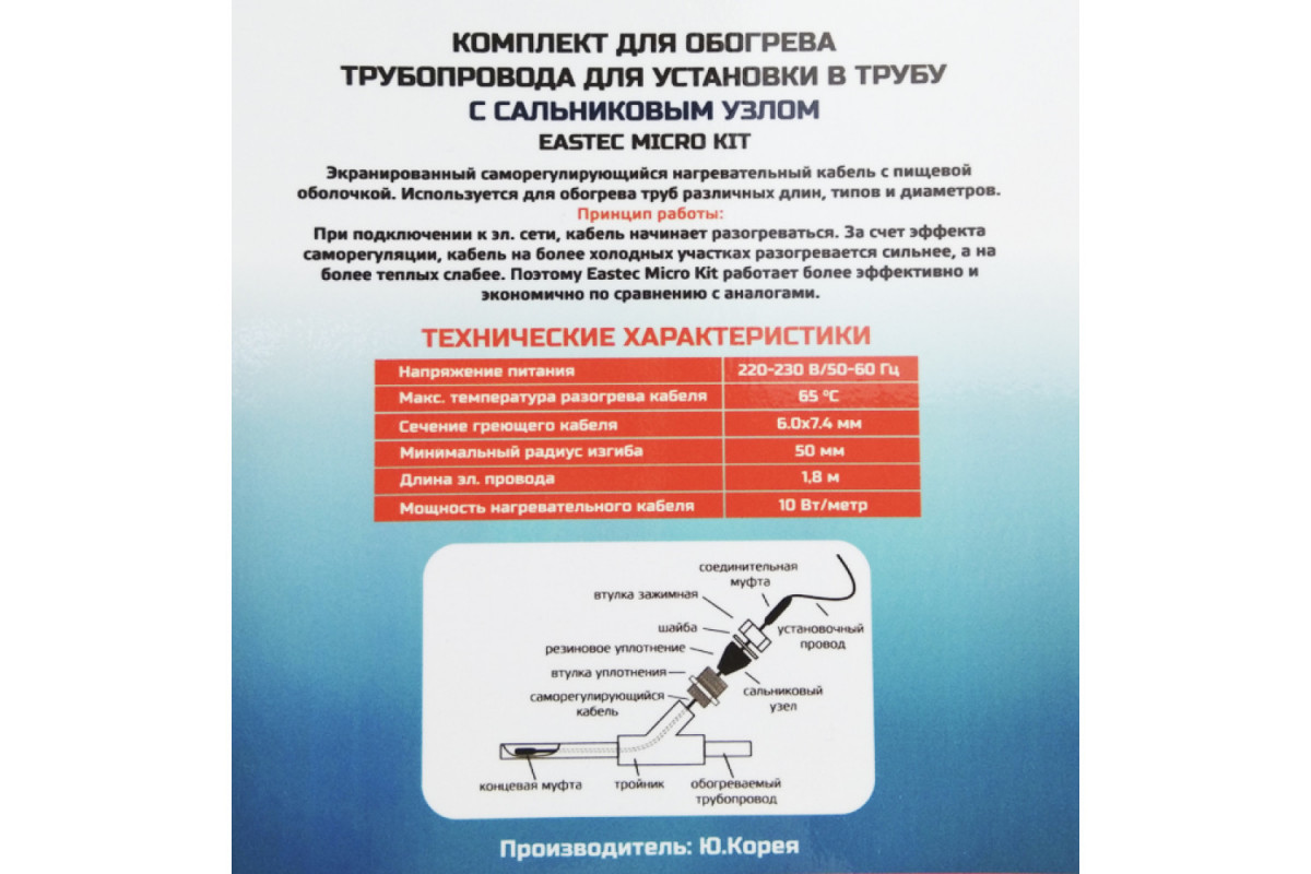 EMK-15 EASTEC комплект обогрева трубопровода для установки в трубу (15м-150 Вт) — это надежное, энергоэффективное и безопасное решение для защиты трубопроводов от замерзания. Благодаря простоте установки и долговечности, этот комплект станет отличным выбором для обеспечения бесперебойной работы водоснабжения в холодное время года.​