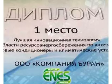 Компания Буран заняла 1 место на конкурсе Лучшая инновационная технология в области ресурсоэнергосбережения по категории «Бытовые кондиционеры и климатические установки» в рамках Пятого международного форума по энергоэффективности и развитию энергетики ENES-2016 в г.Москве.