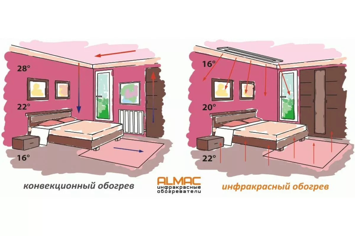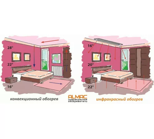 ИК-панели Almac излучают длинноволновое тепло, которое прогревает предметы и поверхности, а не воздух. За счёт этого в помещении создаётся приятное ощущение комфорта, похожее на солнечное тепло. Отсутствие конвекции исключает сквозняки и не поднимает пыль.