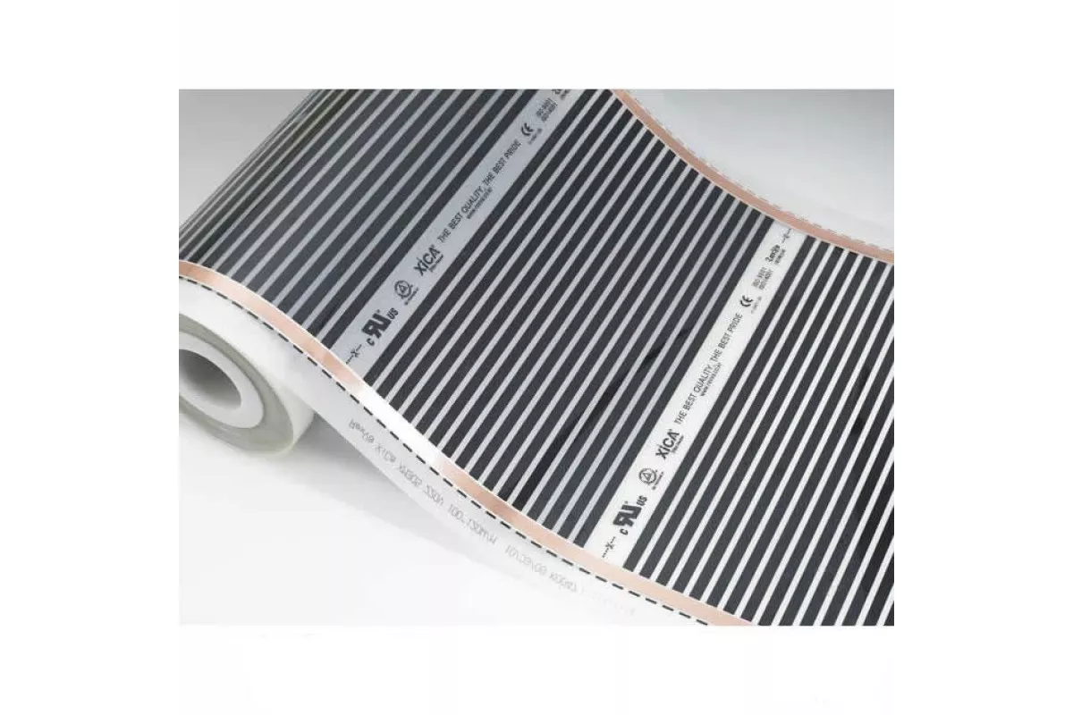 Инфракрасный пленочный теплый пол состоит из полос углеродного материала шириной около 1,5см, которые соединены между собой при помощи медных шин с серебряным покрытием, которые и проводят электрический ток. Нагревательный элемент заламинирован с двух сторон плотным полимером, который не задерживает инфракрасное излучение и обеспечивает отличную защиту от попадания влаги, пробоев и возгорания.