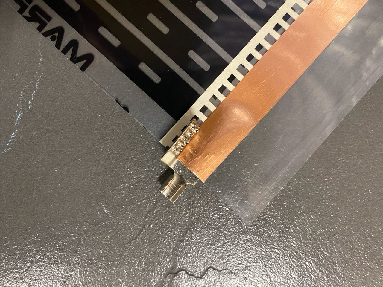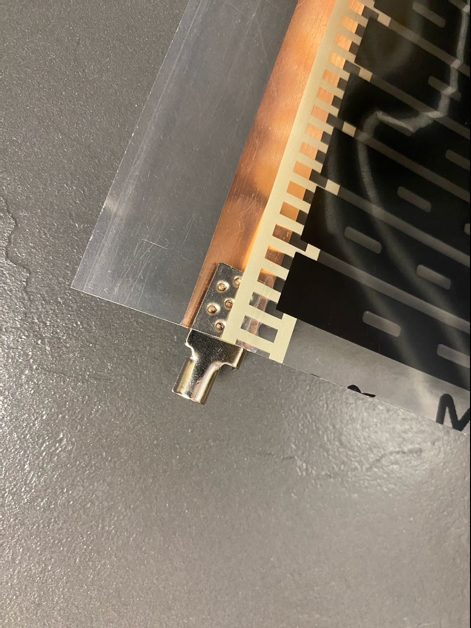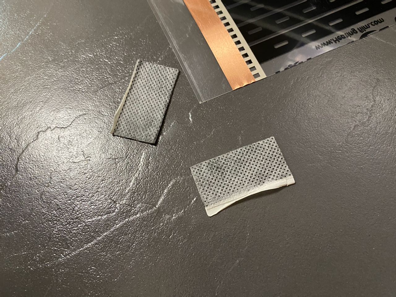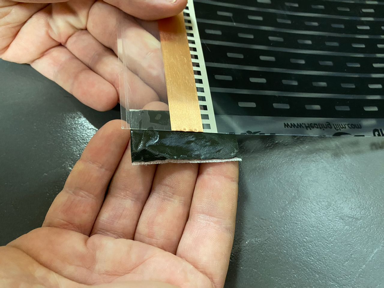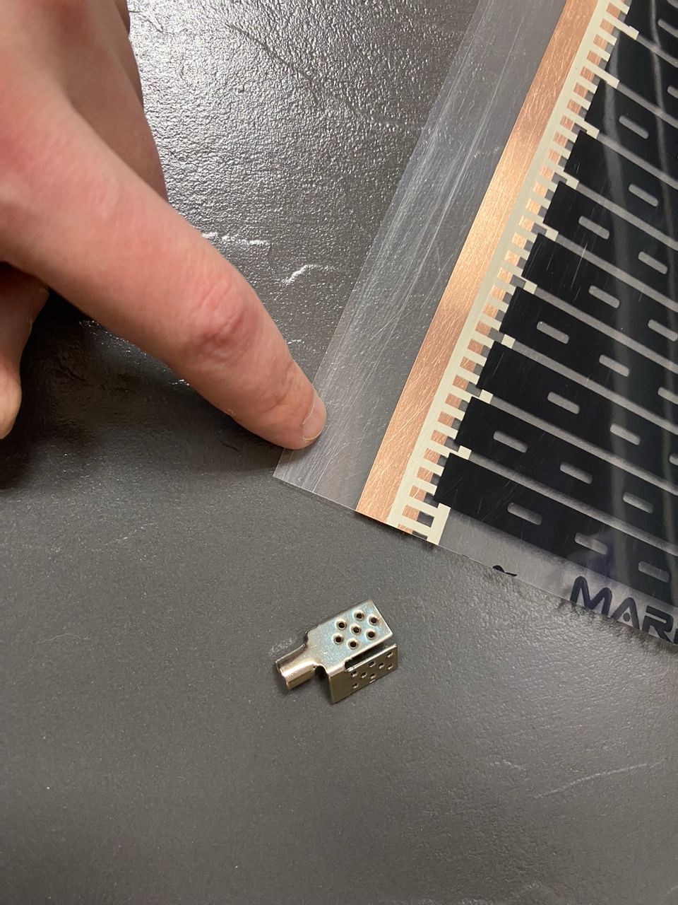 Именно в это месте медная шина не имеет ламинации с основным материалом. Нам необходимо разъединить пленочный слой от медного контакта.