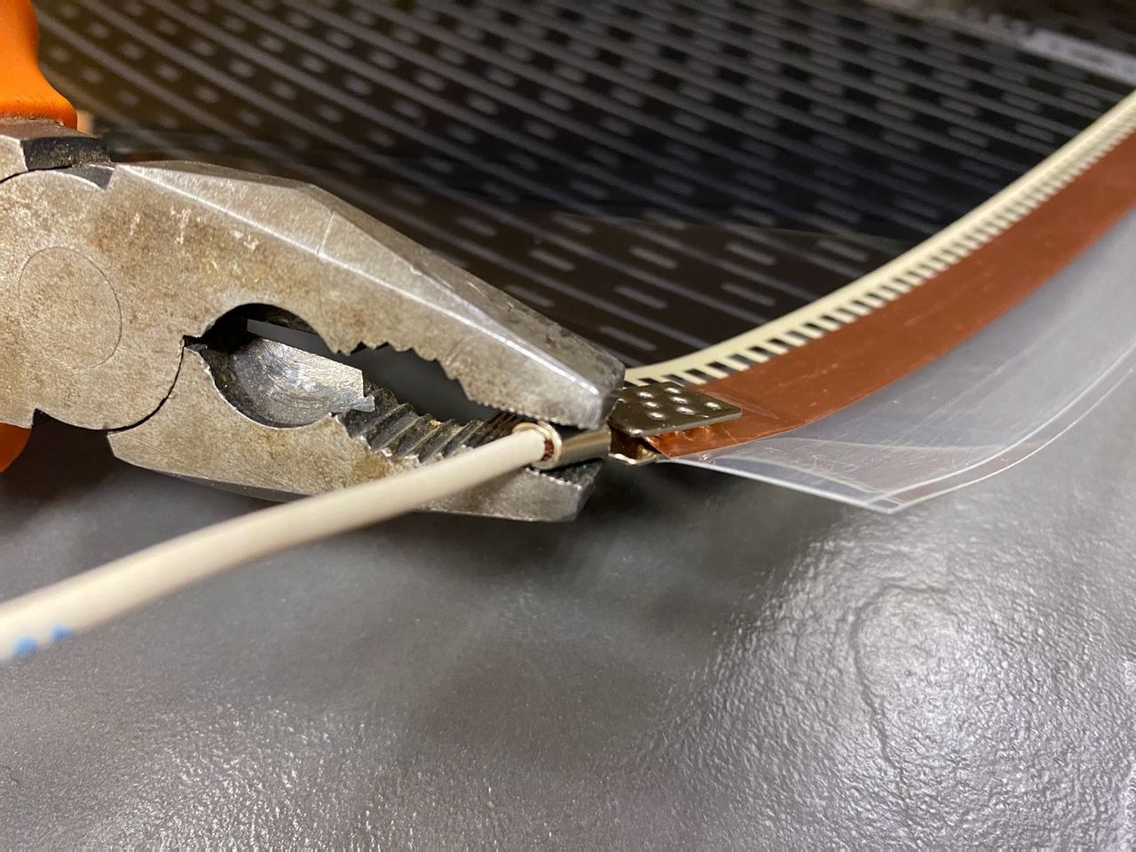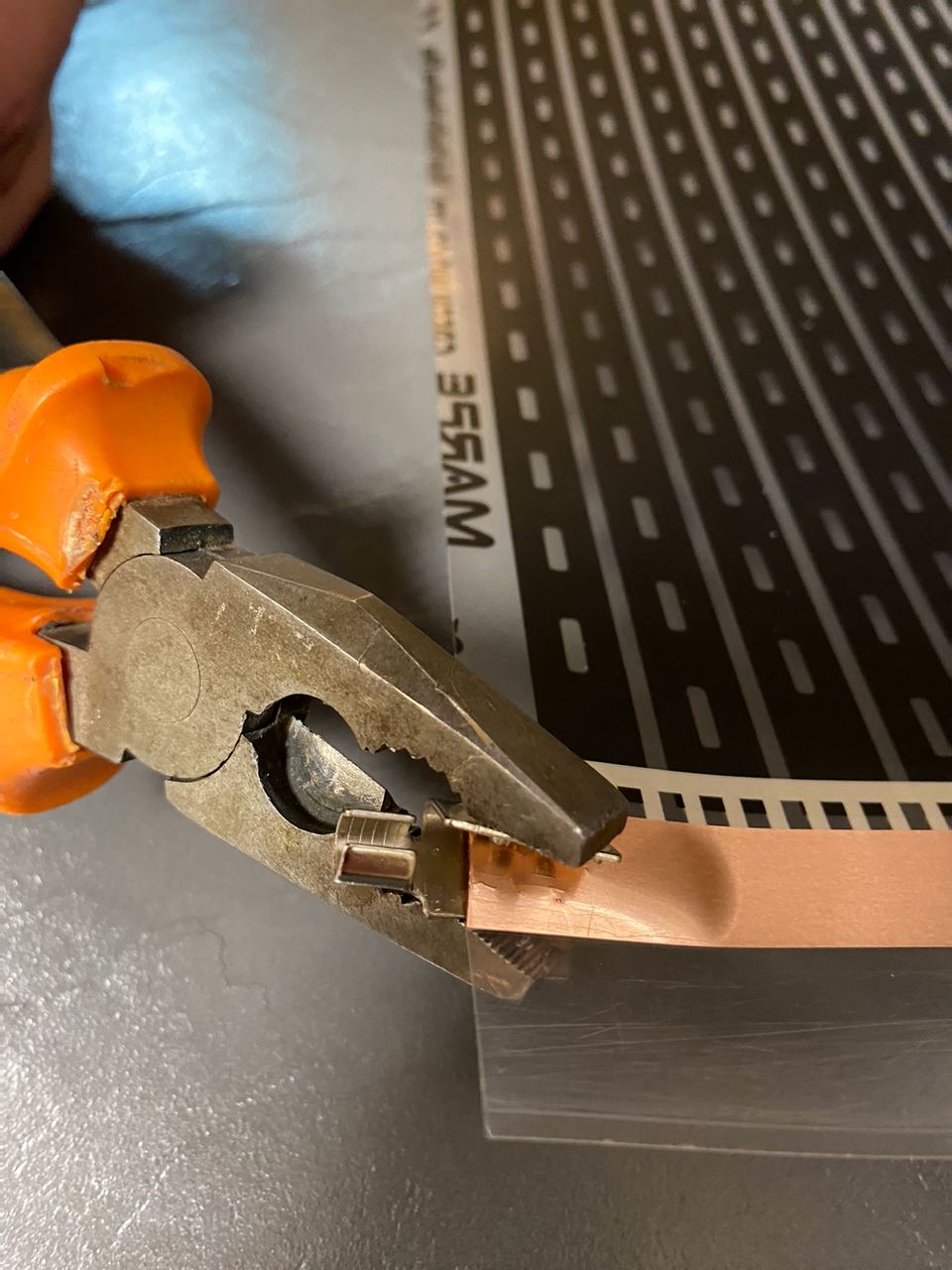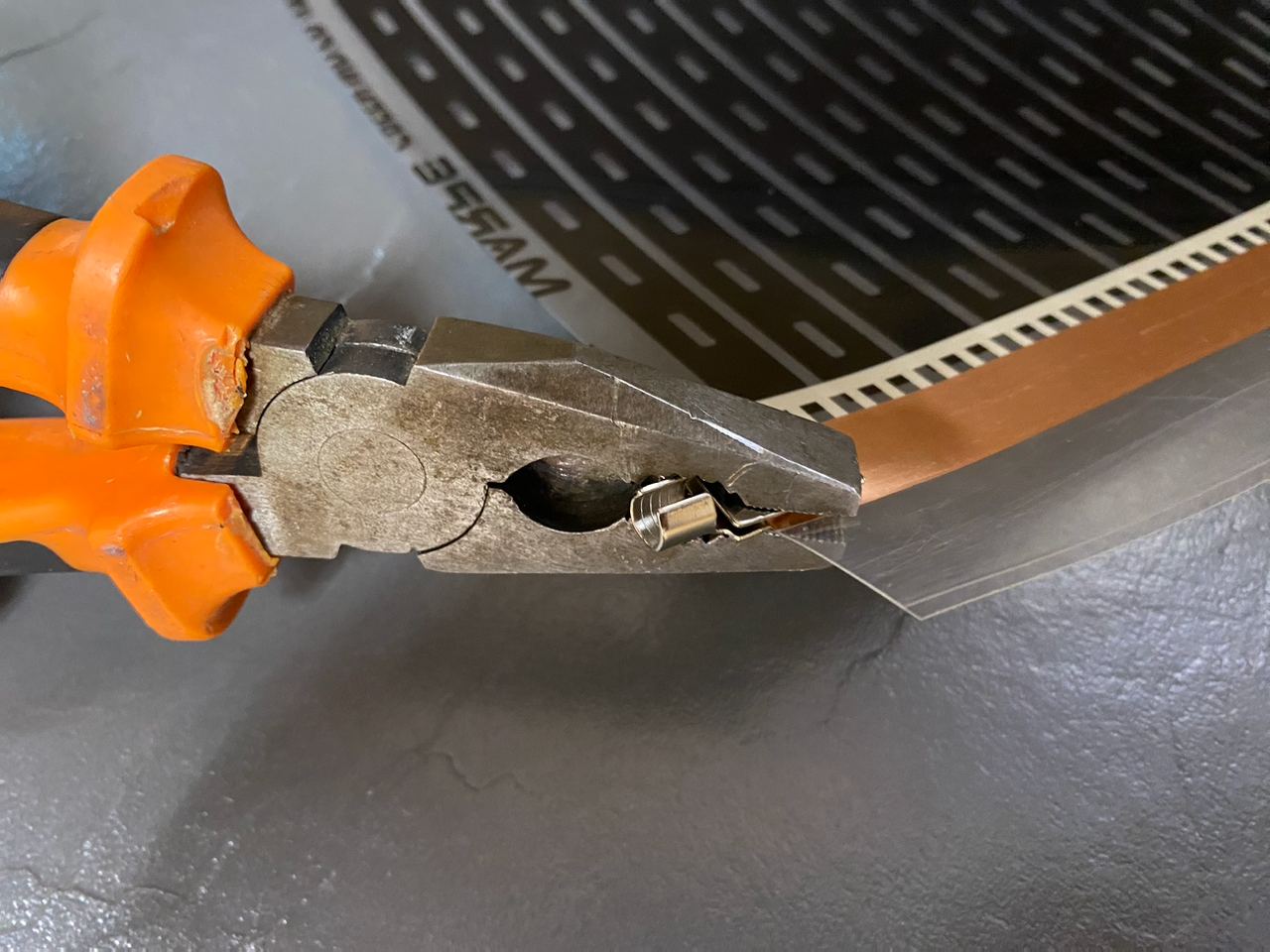 Повторяем действие со второй медной шиной по аналогии. Далее вооружаемся плоскогубцами и плотно зажимаем контакт.