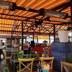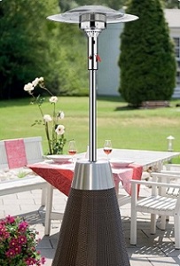 Следующим по популярности можно считать газовые обогреватели. Они вошли в обиход сравнительно недавно, но уже прочно завоевали себе нишу оборудования для заведений класса повышенного уровня комфортности. Смотрится такой газовый обогреватель весьма внушительно. Часто его устанавливают на открытых верандах без потолка или с высоким потолком купольного типа. Хотя, у них нет защитного стеклянного экрана, как у световых обогревателей, они достаточно безопасны и обжечься от соприкосновения с поверхностью сложно, т. к. доступ к нагревательному элементу надежно закрывает многослойная металлическая сетка.