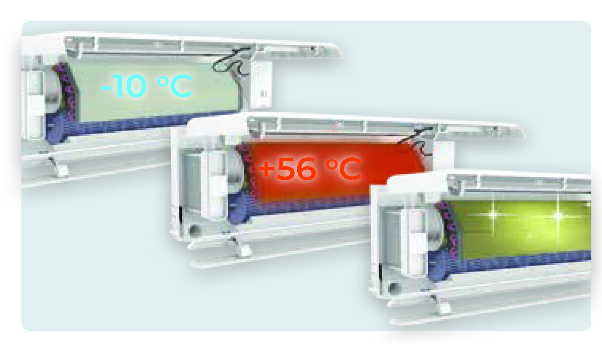 - Система самоочистки внутреннего блока способом заморозки/оттаивания/стерилизации при +56 °С — эффективно справляется с любыми загрязнениями, всегда содержит теплообменник в состоянии идеальной чистоты.