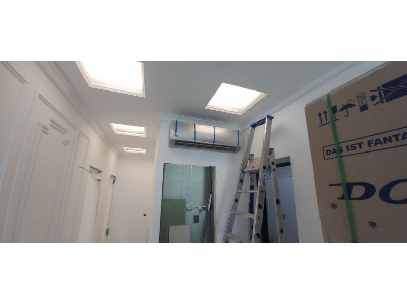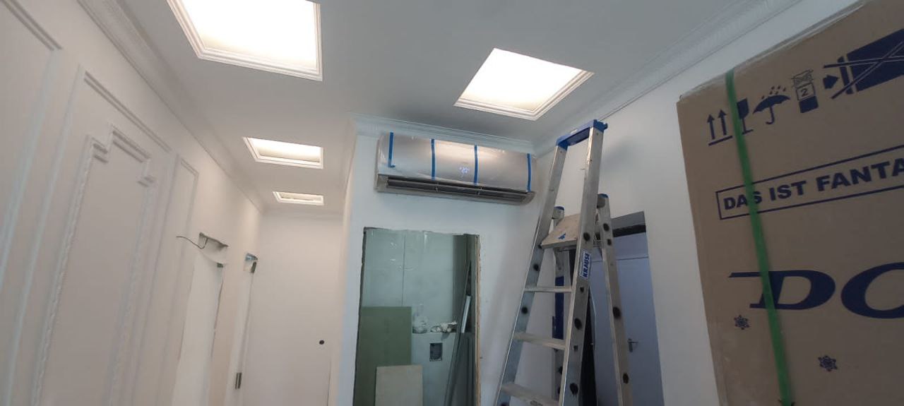 Дело в том, что для установки кондиционера пришлось проложить трассу длинной аж 40 метров ? так как наружный блок должен был находится в специально отведённом техническом помещении на этаже, а также пришлось делать специальный проект для согласования с Управляющей компанией дома для последующей установки.