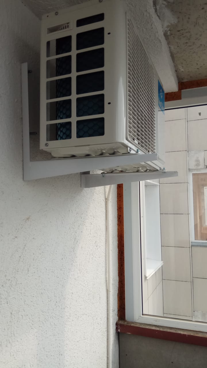 Заказчик пожелал разместить кондиционер на «простенке» между кухней и жилой зоной квартиры-студии. Так же, особое пожелание клиента было размещение наружнего блока сплит-системы в пределах лоджии квартиры, так как управляющая компания дома не даёт разрешение на навеску блока на фасаде.