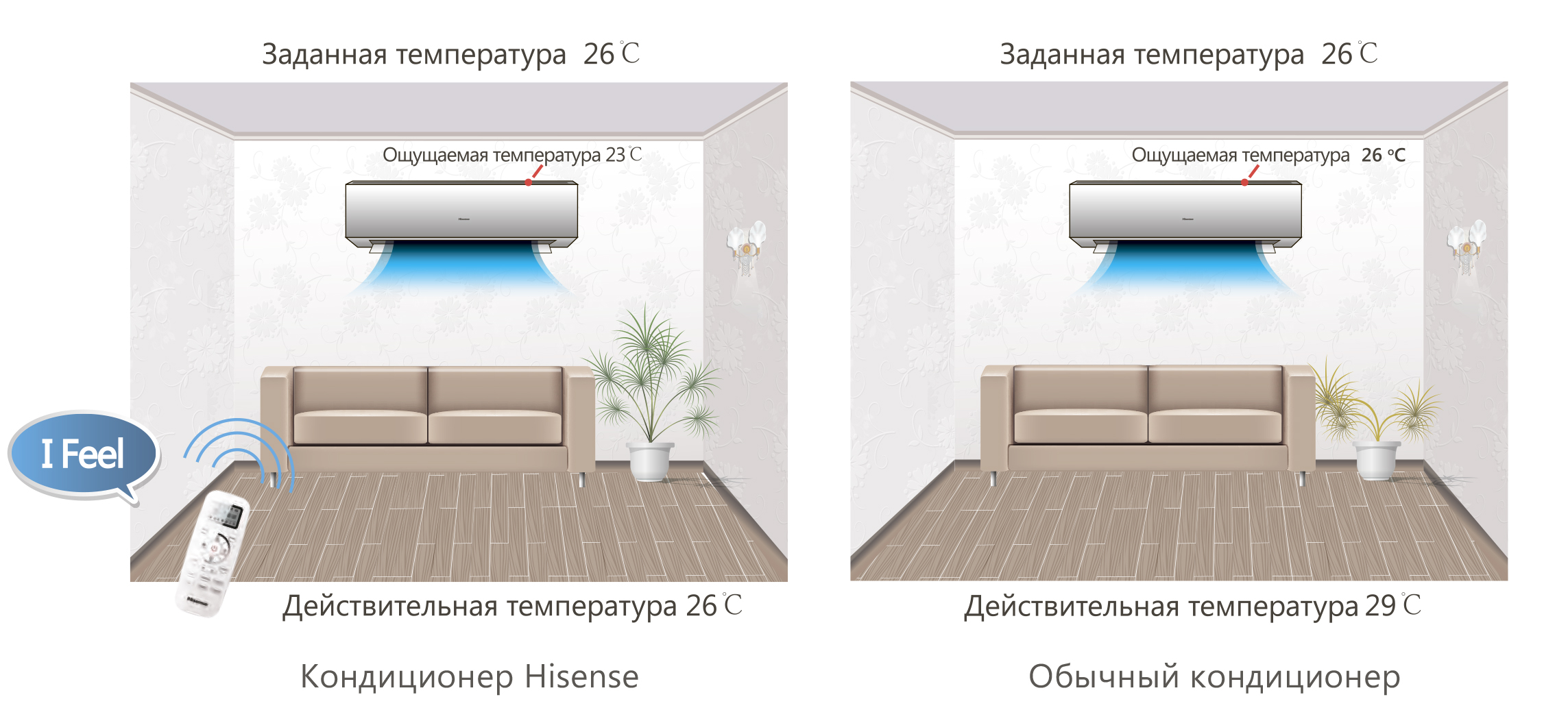 - I Feel — поддержание заданной температуры в зоне нахождения пульта ДУ. Это возможно благодаря встроенному в пульт температурному датчику.