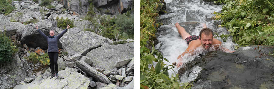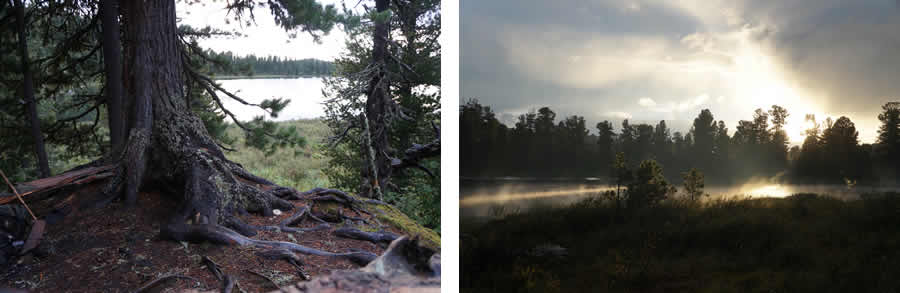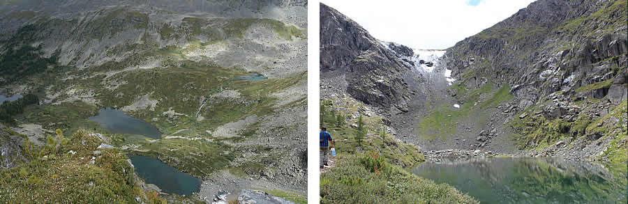 Нас окружали живописные кедры и лиственницы, заросли карликовой березы и ивы, поляны бадана, можжевельника, мха и другой растительности альпийских лугов и высокогорной тундры. Вода в озерах холодная и очень чистая, рыбы в ней нет, наверное создана специально для любования. Зато много веселых и юрких бурундучков. Вокруг много причудливых скальных ансамблей, есть любопытные пещеры и небольшие водопады.