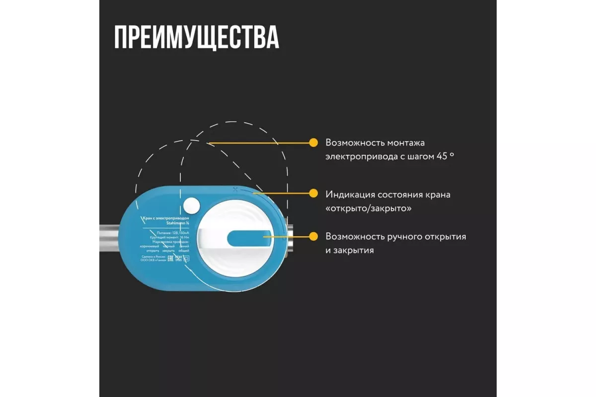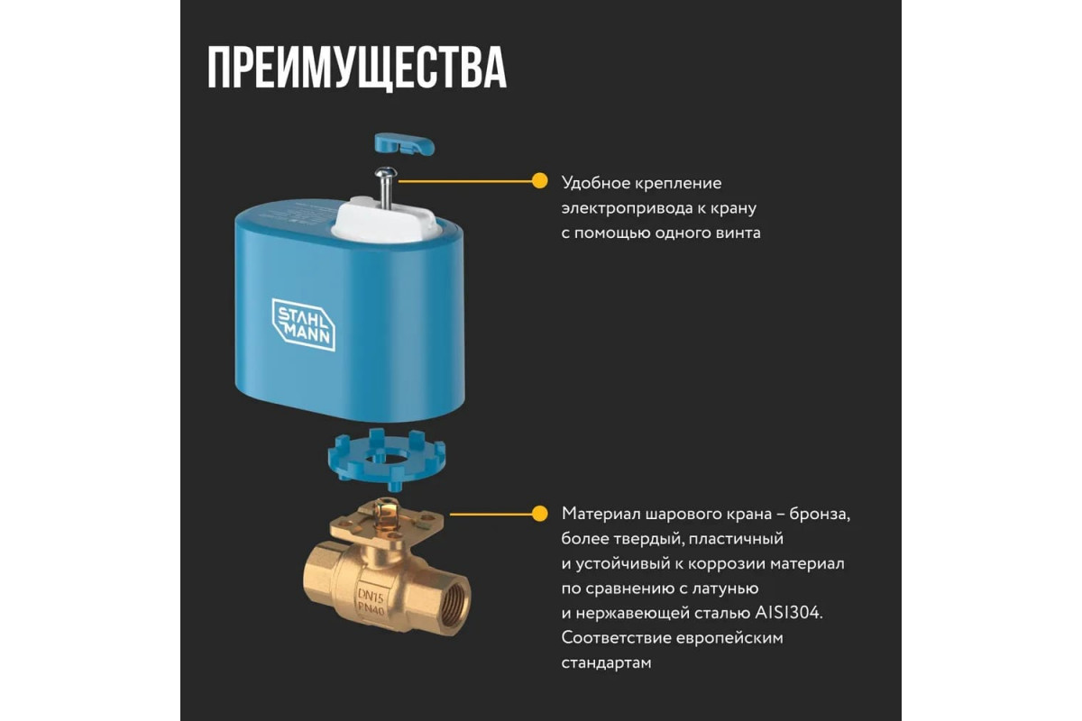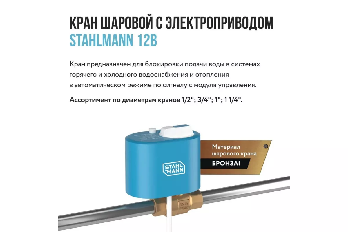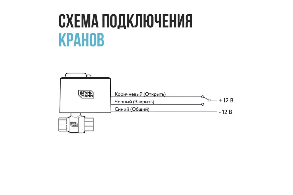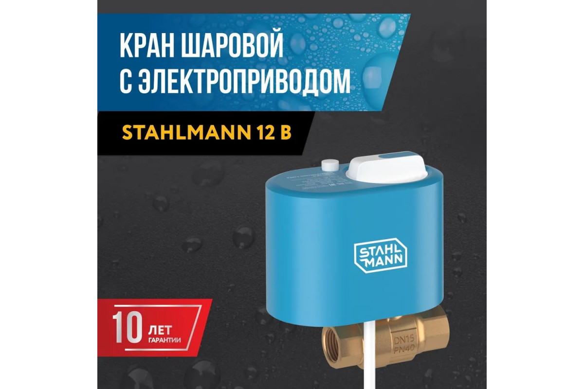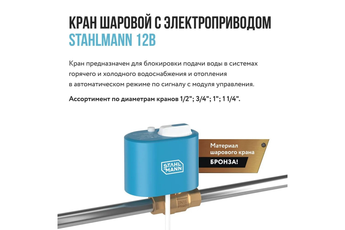 Кран шаровой с электроприводом Stahlmann 3/4F 12В предназначен для блокировки подачи воды в системах горячего и холодного водоснабжения и отопления в автоматическом режиме по сигналу с модуля управления.