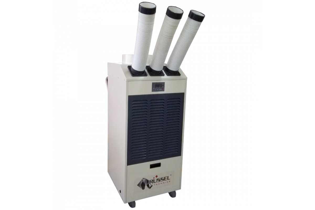 Мобильный промышленный кондиционер RŬSSEL Technics RPAC-60H представляет собой единый корпус, установленный на колеса для передвижения. Основными частями кондиционера являются: испаритель (расположен на передней панели, закрытый фильтром и защитной решеткой), конденсатор (расположен сзади кондиционера и закрыт решеткой), компрессор, вентиляторы конденсатора и испарителя, панель управления (расположена на передней панели кондиционера), ручка для передвижения, воздухораздающий патрубок, защитная решетка вентилятора конденсатора, сетевой шнур. Оборудование полностью заправлено хладагентом и готово к работе. Детальное описание кондиционера, инструкция по эксплуатации, обслуживанию и ремонту представлены в разделе Тех. Информация.