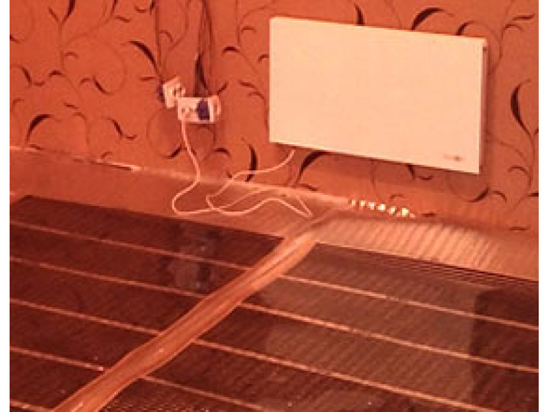 Согласно расчетам, уложили нужное количество греющей инфракрасной пленки марки Q-Term и для управления подогревом пола установили регулятор RTC 70.26. Дополнительно установили настенный обогреватель Теплофон мощностью 0.7 кВт. Теплый пол и обогреватель можно использовать одновременно или по-отдельности.