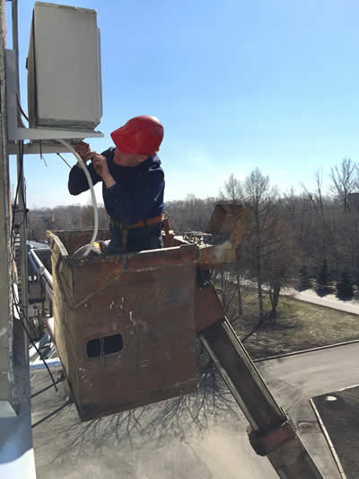 Монтажники Питерского филиала компании «Буран», с автовышки, установили внешний блок инверторной сплит-системы Mitsubishi Electric MSZ-SF25.
