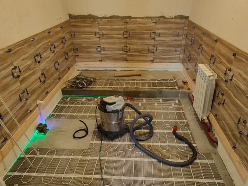 Во второй наш приезд у Натальи снова кипела работа — теперь за дело взялся наш мастер Евгений Меркушин, человек с золотыми руками и безупречной репутацией. Именно он выполнил монтаж в ванной комнате, установив нагревательный мат Russian Heat «RH150» площадью 5,0 м² и мощностью 750 Вт, а также современный терморегулятор RTC 70.26.