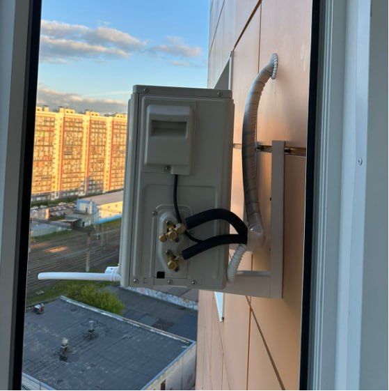 После того как трасса была успешно проложена, специалисты приступили к монтажу наружного блока на вентилируемый фасад. Этот этап включал в себя: