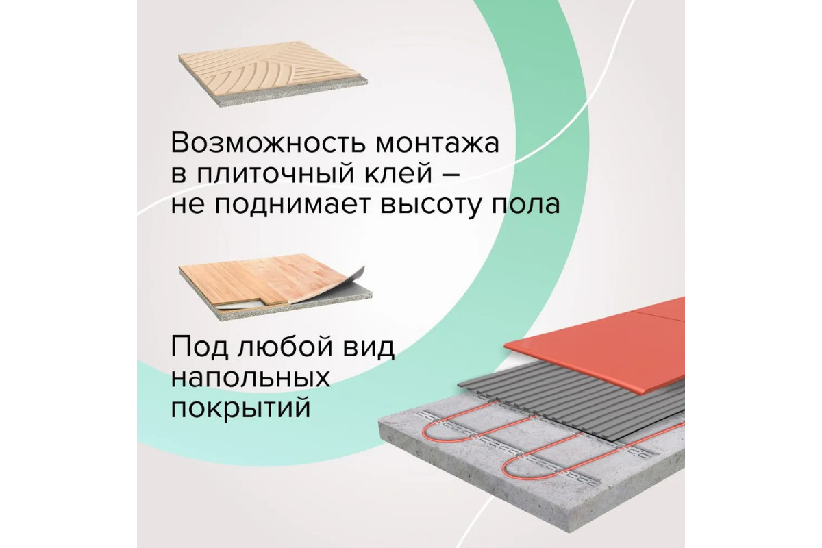 Предназначен для монтажа в стяжку толщиной 2-5 см. Обеспечивает подогрев поверхности пола для создания дополнительного комфорта или основного обогрева помещения. Область применения: гостиные, кухни, ванные комнаты, столовые, детские комнаты. Рекомендуемые напольные покрытия: керамическая плитка, керамогранит, природный камень. Применяется для монтажа в помещениях со сложной конфигурацией.