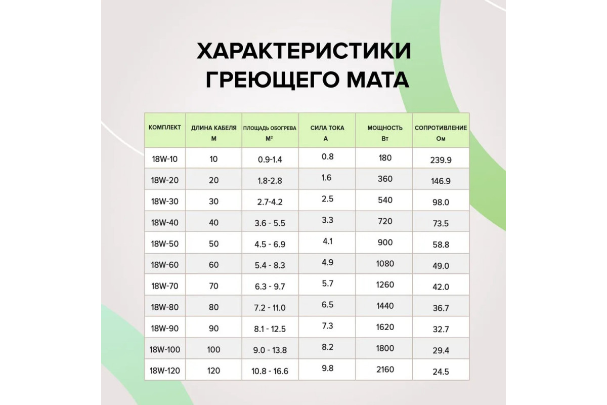- 18 Вт/ пог. м или 130-240 Вт/м2 (зависит от шага укладки витков кабеля) — для стандартных и холодных помещений