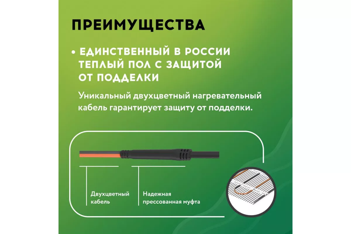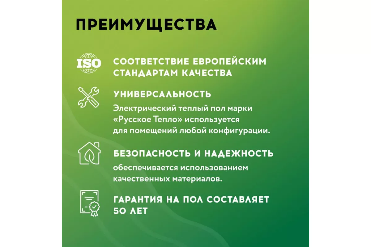 Нагревательный мат для теплого пола Русское тепло 3.0 м² 480 Вт сочетает в себе эффективность, надежность и простоту установки. Он обеспечивает комфортный обогрев пола, экономию энергии и подходит для использования в различных помещениях. Благодаря высоким стандартам качества и безопасности, этот мат является отличным выбором для создания теплого пола в вашем доме.