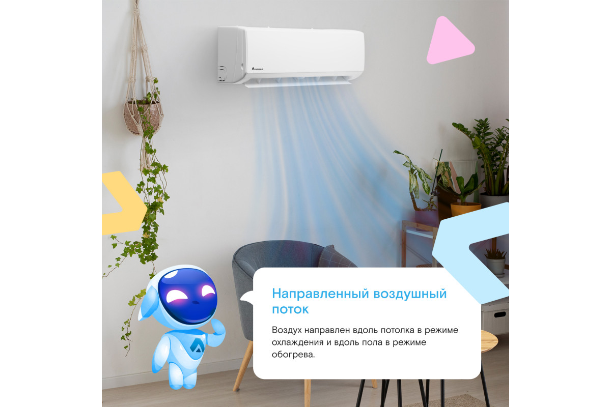 • Направленный воздушный поток: при охлаждении воздух направляется горизонтально, а при обогреве — вертикально, что улучшает конвекцию и равномерность распределения температуры. ​