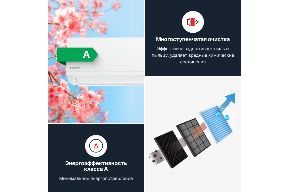 Выбирая Kentatsu Ichi on/off, вы получаете надежное и энергоэффективное устройство с классом энергоэффективности «A» . Это означает минимальное потребление электроэнергии и снижение затрат на эксплуатацию. Кроме того, сплит-система оснащена многоступенчатой системой очистки воздуха, включая фильтр высокой степени очистки и фильтр холодного катализа, что обеспечивает чистый и свежий воздух в вашем доме .