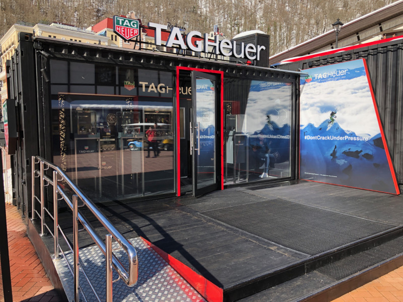 Торговый павильон Швейцарского часового бренда TAGHeuer выполнен из грузовых контейнеров, что делает их полностью мобильными.