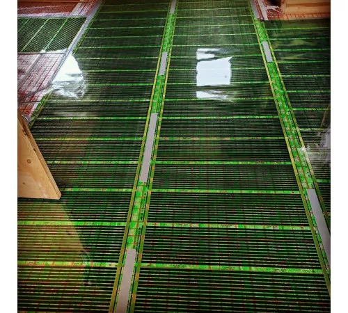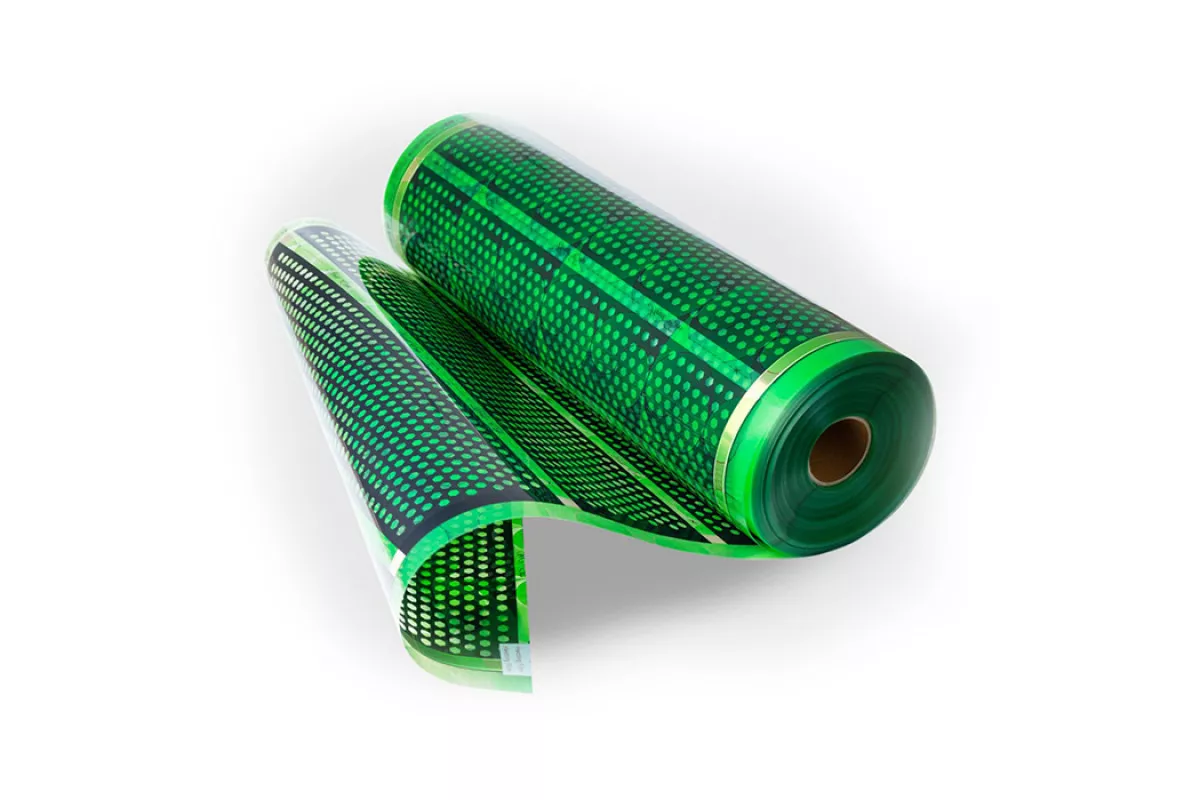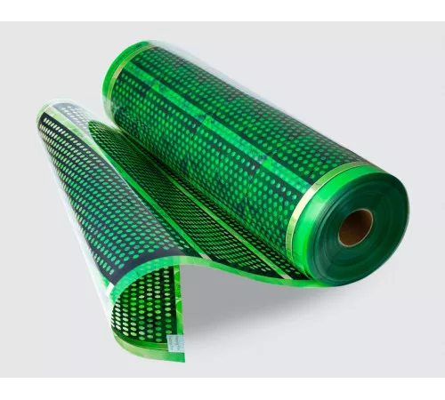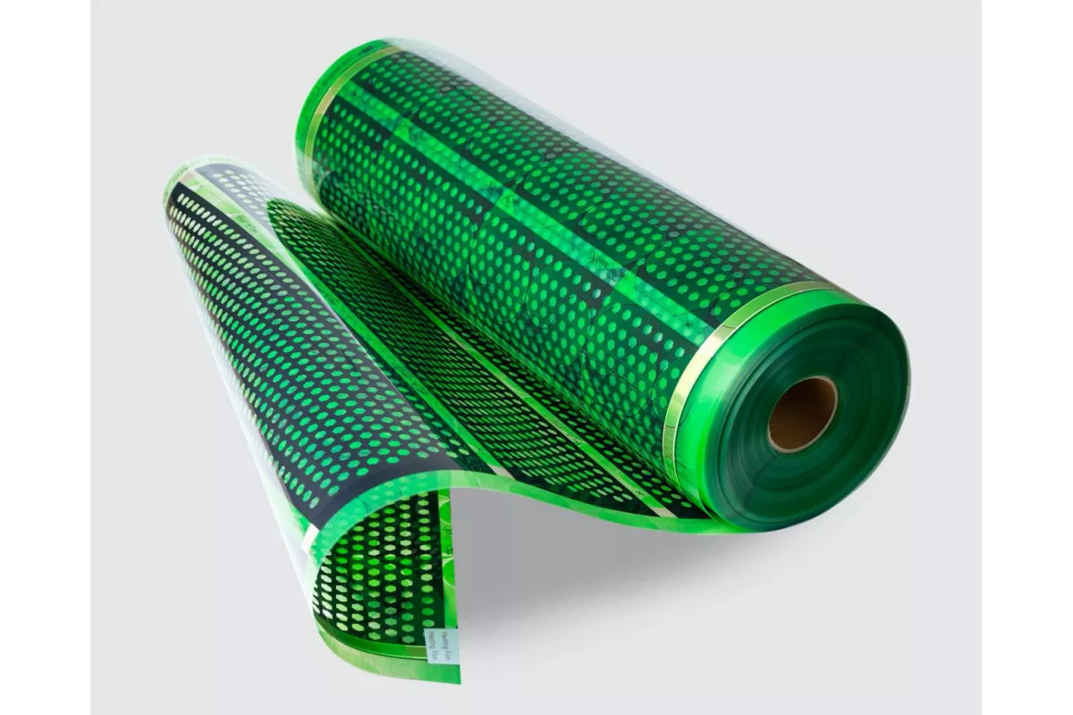 В состав пленки добавлены специальные примеси, позволяющие распределять нагрев за более короткое время и соответственно, экономить электроэнергию. Цвет полотна пленки – светло зеленый.