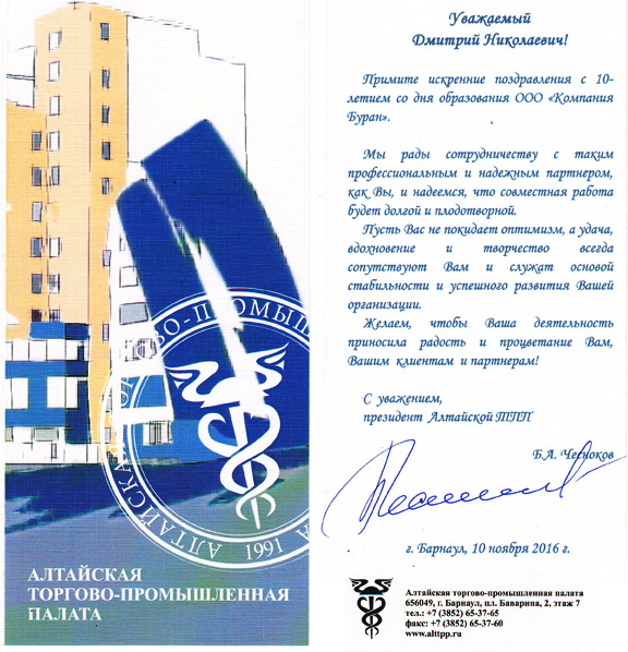 Поздравление с Юбилеем от Алтайской торгово-промышленной палаты