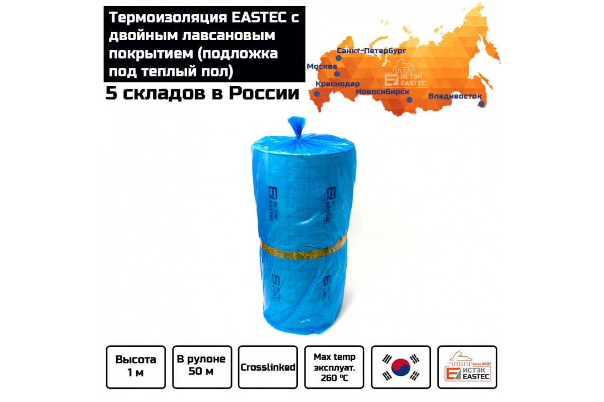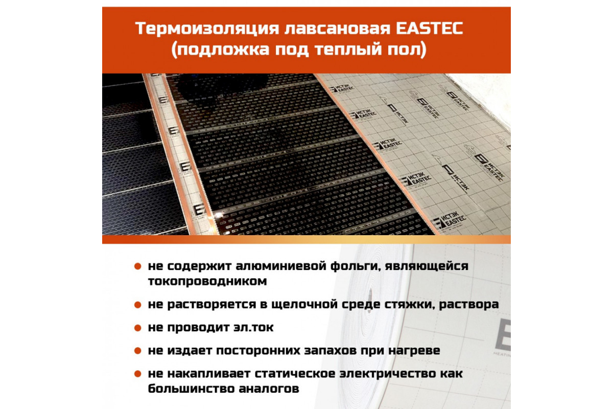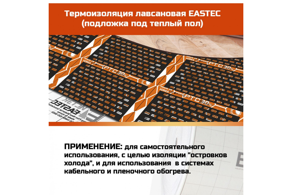 Профессиональная корейская теплоотражающая подложка Eastec толщиной 3 мм — это универсальный теплоизоляционный материал. Его можно использовать как самостоятельно для изоляции "островков холода", так и в системах кабельного и пленочного обогрева. Подложка не содержит алюминиевой фольги, которая является токопроводником, и не включает в себя полиэтилен. Благодаря своим особенностям, она не растворяется в щелочной среде стяжки или раствора, не проводит электрический ток и не накапливает статическое электричество, в отличие от большинства аналогов. Материал плотный, обладает высокими показателями влаго- и паростойкости, а также демпфирующими свойствами. Он асептичен, устойчив к плесени, грибам и насекомым. Подложка идеально подходит для всех видов пленочных теплых полов под ламинат, паркет, линолеум и ковролин (для последних двух покрытий требуется промежуточный слой оргалита для дополнительной жесткости). Также она подходит для кабельных теплых полов, укладываемых в стяжку.