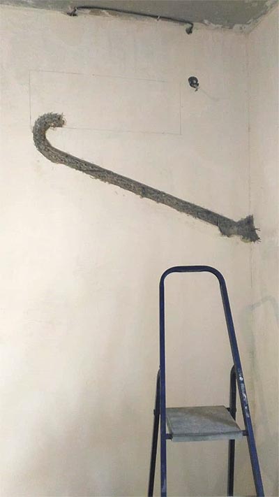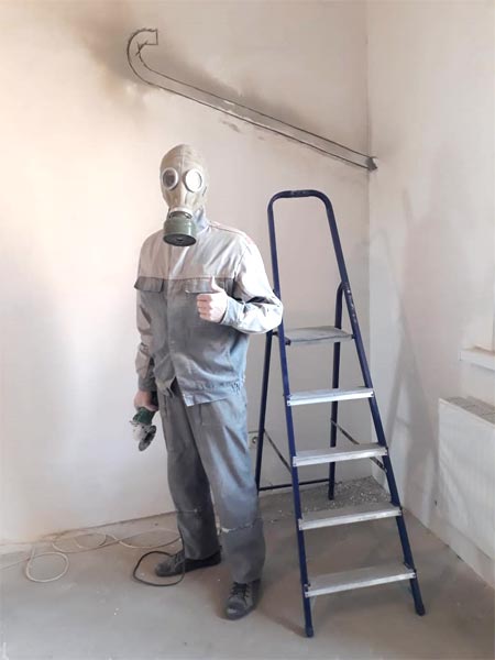 Расположение в комнате внутреннего блока кондиционера потребовало спрятать труботрассу в стене. Работа оказалась пыльная. Так как невозможно было применить штроборез, использовали проверенную временем болгарку и противогаз в придачу.