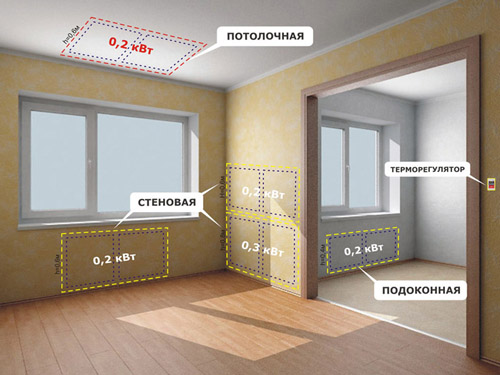 Настенные электрообогреватели рекомендуют к установке на «холодную стену», преимущественно под окнами, на расстоянии 80-100 мм до пола и не менее 1 м. до подоконника. Если вы используете несколько обогревателей для обогрева многокомнатного помещения, то вам не обойтись без установки центрального терморегулятора, управляющего работой группы обогревателей. Устанавливают его на расстоянии не менее, чем 1,5 м от пола, на теплой стене.
