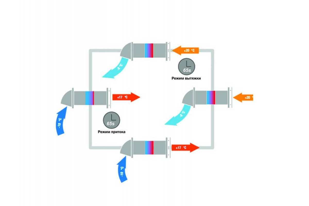Режим тепловой рекуперации: смена режимов приток/вытяжка каждые ~65 сек для нагрева входящего воздуха без затрат электроэнергии.