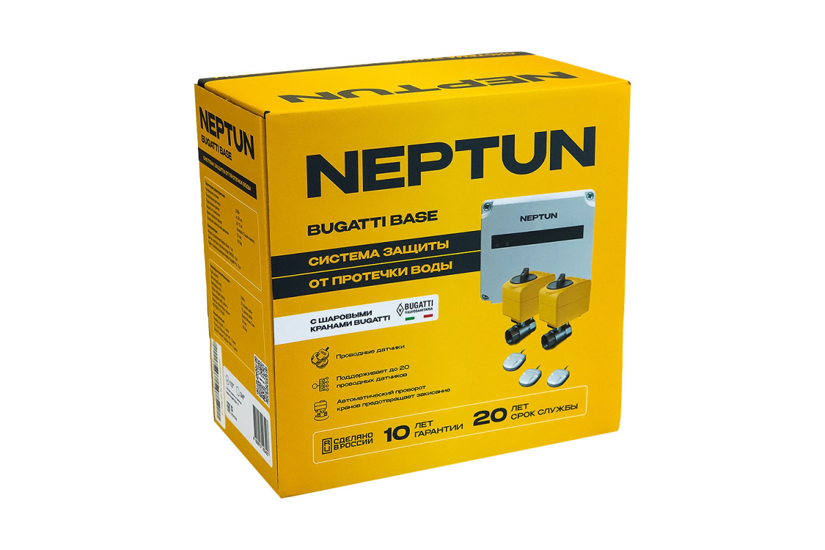 Neptun Bugatti Base - это лучшее соотношение цены и качества. Модуль управления Neptun Base - простое, но при этом очень надежное устройство. Дополнительных функций не много, но если они Вам и не нужны, то это идеальное решение. Главное, что в комплекте идут зарекомендовавшие себя шаровые краны Neptun Bugatti, которые едут напрямую с завода в Италии. У электропривода большое усилие (ломает карандаши), которое никогда не будет лишним с учетом не очень качественной водоподготовки в России, в кране используются самые лучшие уплотнительные материалы (первичный фторопласт, который выдерживает даже серную кислоту) и конечно же - есть ручное аварийное открывание на случай, если не будет питания или электроника выйдет из строя.