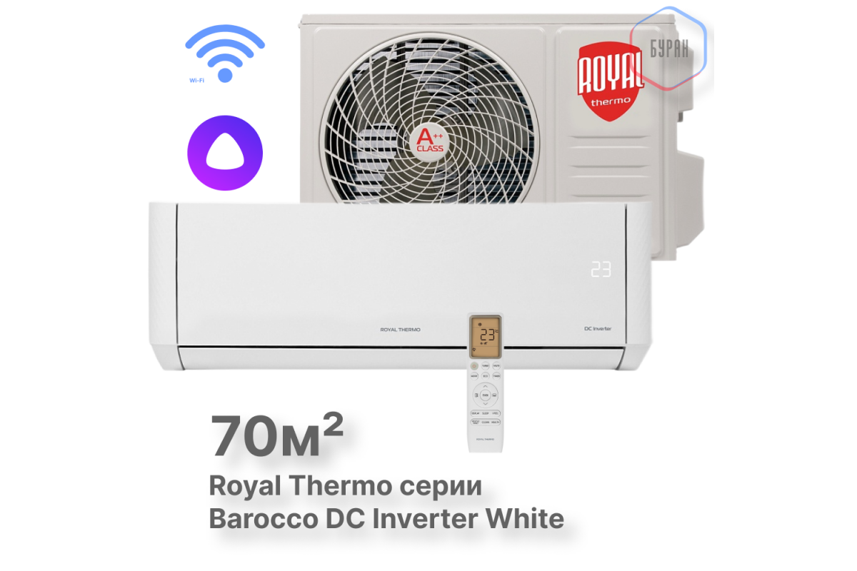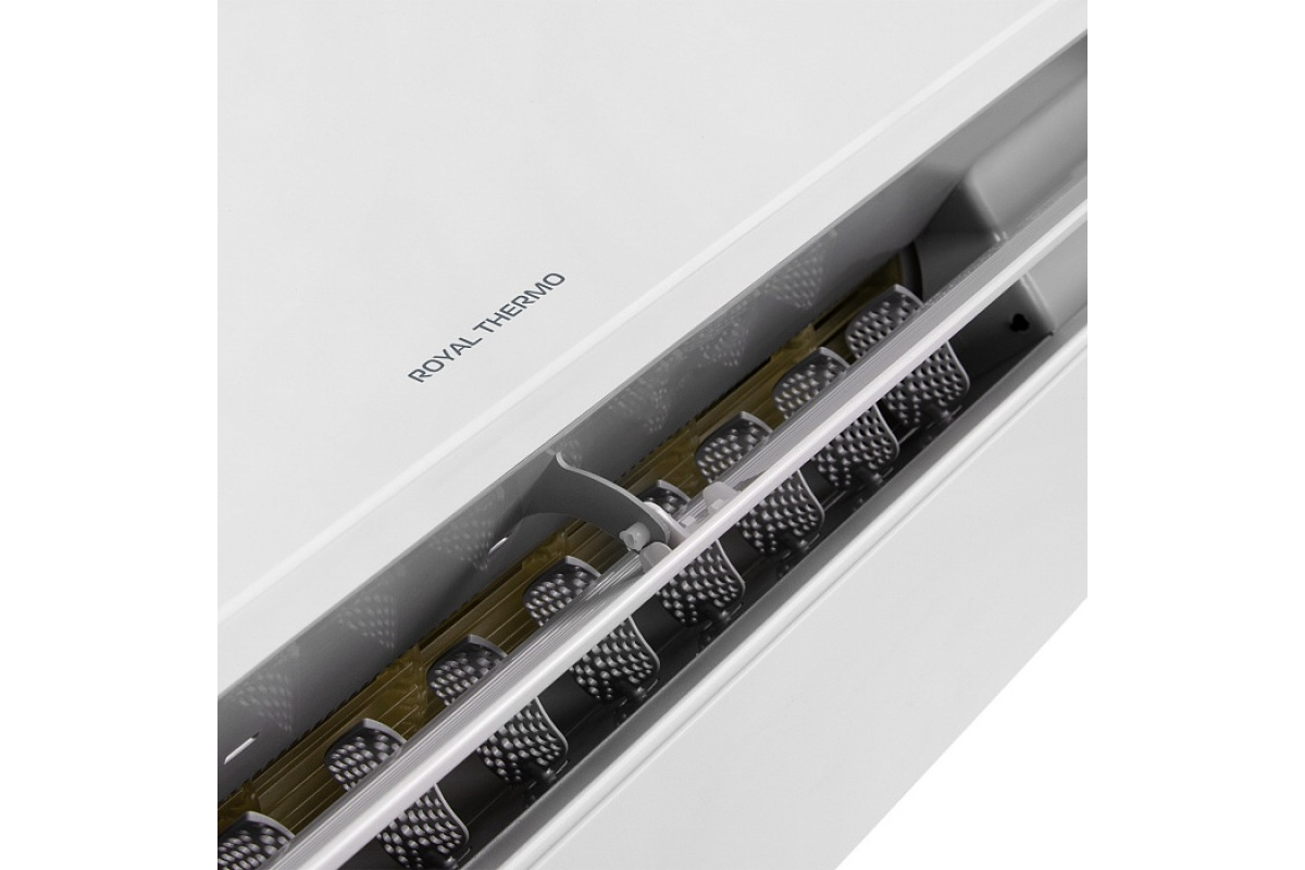 Сплит-система инверторного типа Royal Thermo Barocco DC RTBI-24HN8_V2/white комплект эффективно обслуживает помещения площадью до 70 м². Это идеальный выбор для просторных гостиных, офисов или спален, обеспечивая комфортный микроклимат в любое время года.