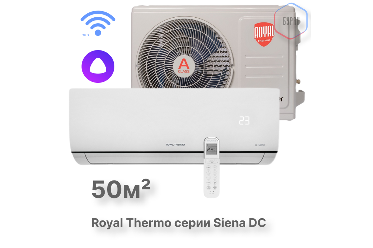 Сплит-система инверторного типа Royal Thermo Siena DC RTSI-18HN8 комплект идеально подходит для помещений площадью до 50 м². Это отличный выбор для спален, небольших гостиных, кабинетов или офисов .​