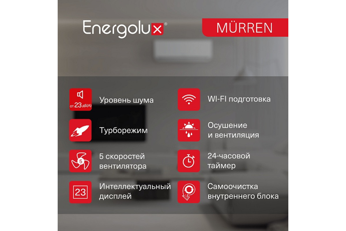 Выбирая Energolux Murren SAS07MR1-A / SAU07MR1-A, вы получаете надежное и стильное решение для создания комфортного микроклимата в вашем доме. Классический дизайн внутреннего блока гармонично впишется в любой интерьер, а глянцевая поверхность придаст элегантности. ​
