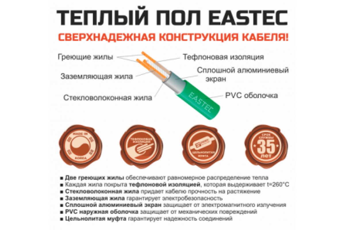 Теплый пол кабельный EASTEC ECC-2400 (20-120) - 120 м.п.( 14,5-17,0 м.кв.) комплект — надёжное решение для комфортного обогрева небольших помещений