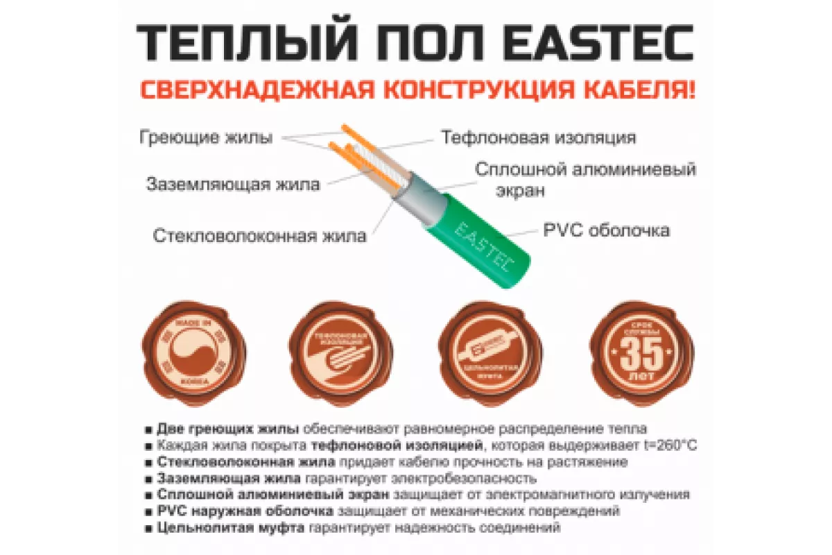 Теплый пол кабельный EASTEC ECC-800 (20-40) - 40 м.п.( 5,2-6,0 м.кв.) комплект — надёжное решение для комфортного обогрева небольших помещений