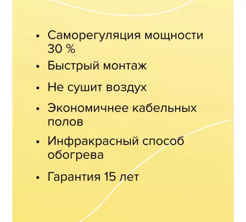 Благодаря эффекту саморегуляции, система автоматически снижает потребление энергии при достижении заданной температуры, что позволяет экономить до 30% электроэнергии по сравнению с традиционными системами обогрева.