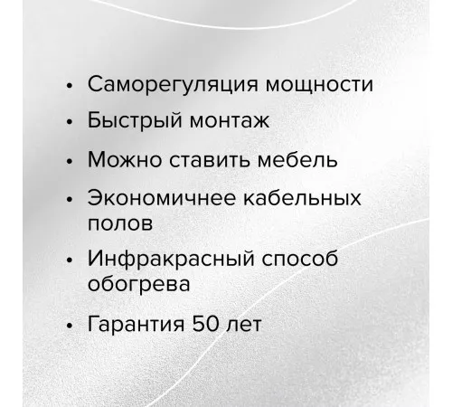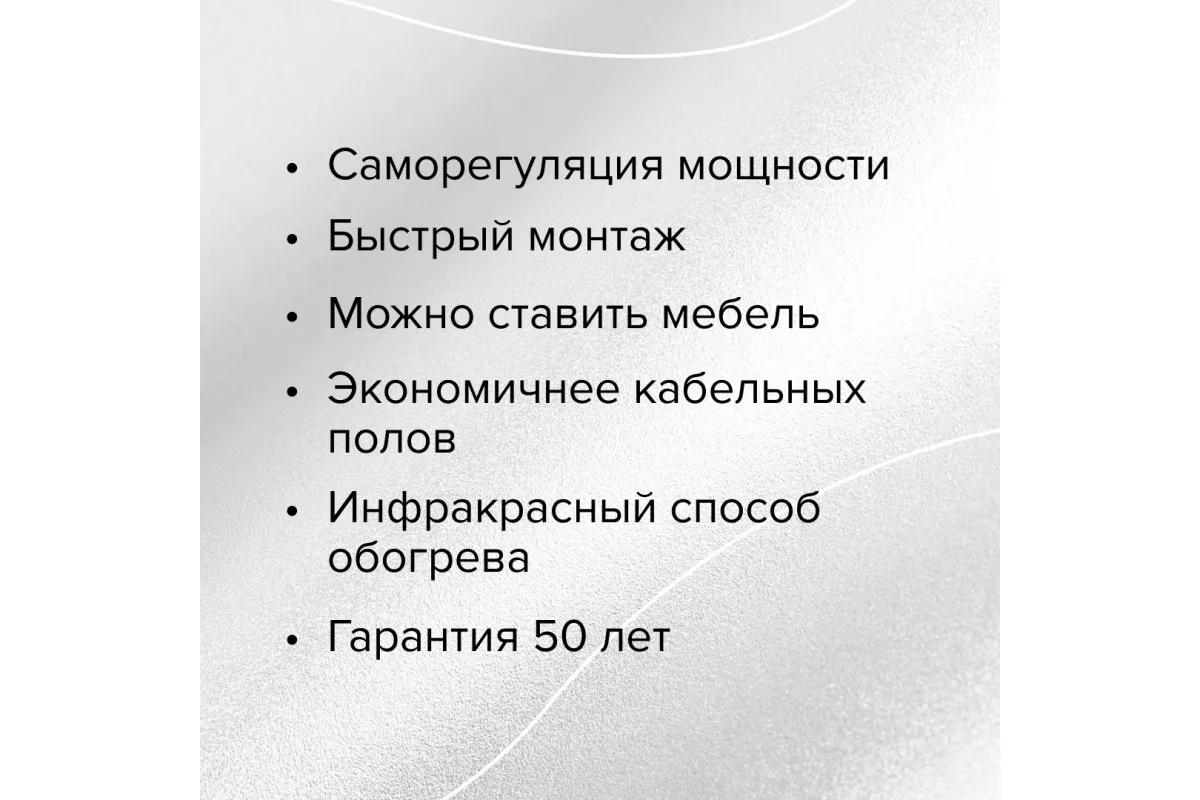 Благодаря инфракрасному излучению с длиной волны 5–20 мкм, теплый пол обеспечивает равномерный прогрев поверхности, создавая комфортные условия в помещении. Антиискровая сетка повышает безопасность эксплуатации, предотвращая возможные короткие замыкания.​