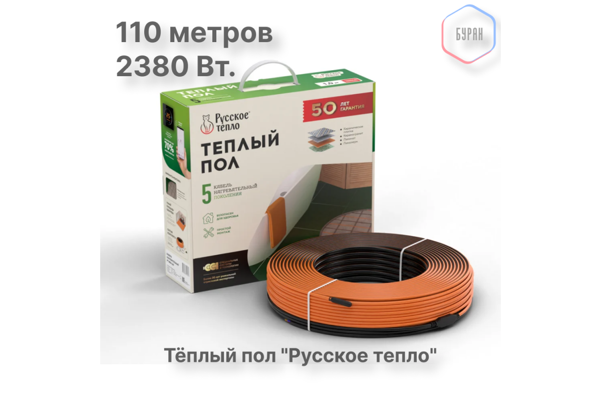 Теплый пол кабельный "Русское тепло" РТ-2380-110,0 — надёжный нагревательный мат под плитку