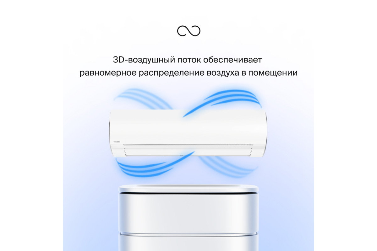 • 3D-распределение воздушного потока: равномерное охлаждение или обогрев всего помещения благодаря автоматическому качанию горизонтальных и вертикальных заслонок.
