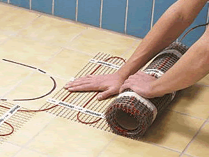 Для начала укладывают нагревательные маты, затем их закрепляют к основанию рабочей поверхности. Каждый нагревательный элемент имеет два места подключения провода длиной до четырех метров каждый, источником питания служит электрическая сеть в 220 В. В случае подогрева стен помещения, используются электрические устройства, работающие от напряжения в 42 В. Современные электрические маты, обладают повышенной защищенностью от попадания влаги.