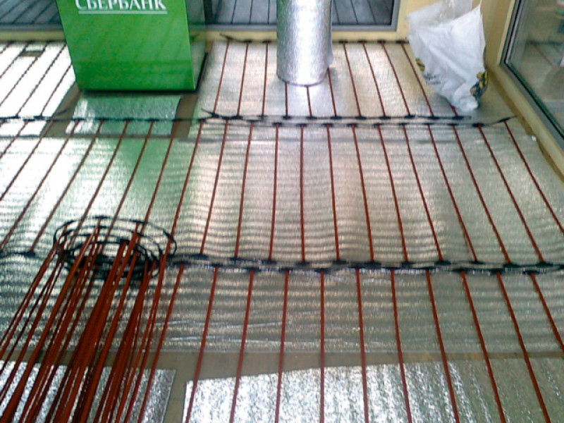 Очередной нестандартной задачей для нашей компании стало обращение крупного заказчика. Новосибирский Сбербанк обозначил потребность в основном отоплении уличных павильонов дополнительных офисов, оборудованных терминалами приема оплаты и банкоматами. На первый взгляд ничего сложного, но усложняющим фактором послужила практически стопроцентное остекление стен. В дополнение к этому, требование заказчика было полное отсутствие видимых отопителей и любых других систем отопления, кроме тепловой завесы над дверью. В помещении необходимо было поддерживать температуру 18 в зимний период. С учётом сурового сибирского климата и высоких теплопотерь помещения сделать это было достаточно непросто. С учётом доли риска на то что система не справиться в сильные морозы было установлено 19 квадратных метров карбонового мата. Что составило практически 100 % от общей площади помещения. За управление системой отопления отвечал один программируемый терморегулятор с двумя датчиками температуры:  считывания температура на поверхности пола, и  отключения системы по температуре воздуха.