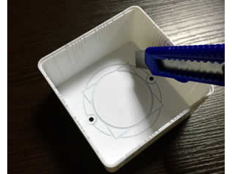Этим ножом с внутренней стороны коробки вырезаем отверстие нужного размера, такое, чтобы в него плотно вошла колодка терморегулятора. Для облегчения этой операции в коробке есть разметка по которой производим вырез отверстия.