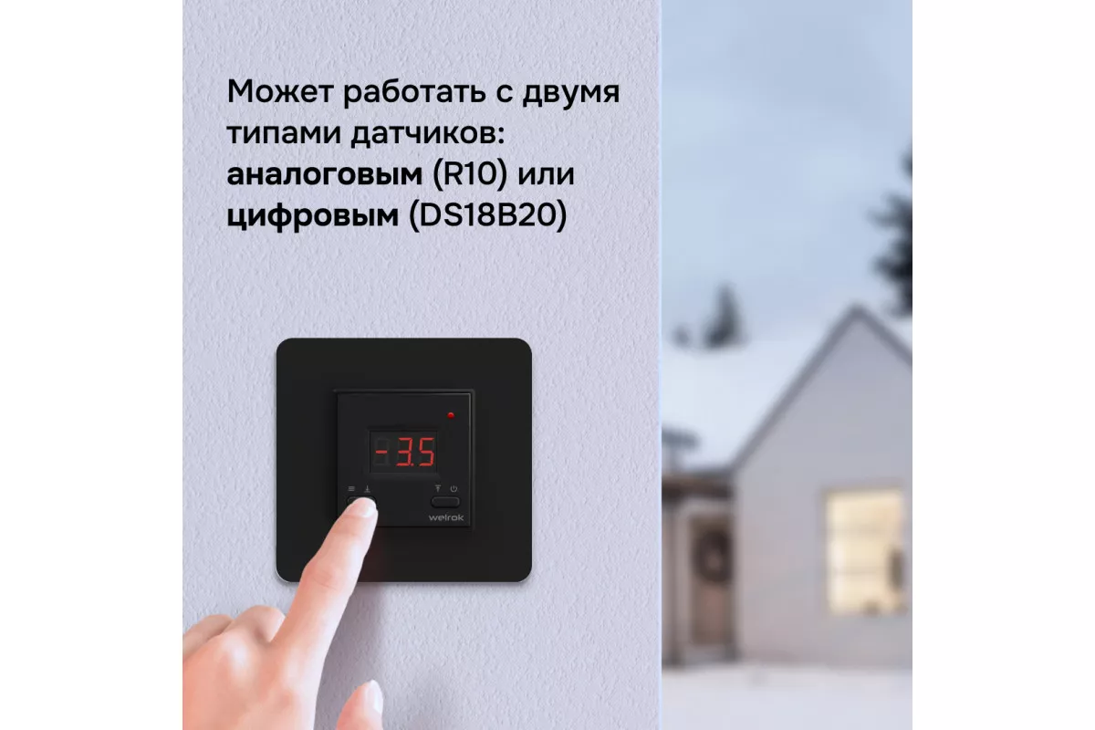 Welrok KT BK оснащен цифровым интерфейсом с двумя кнопками управления и ярким дисплеем, что обеспечивает простоту настройки и контроля температуры. Устройство поддерживает работу с аналоговыми (R10) и цифровыми (DS18B20) датчиками температуры, позволяя адаптировать систему под конкретные условия эксплуатации.​