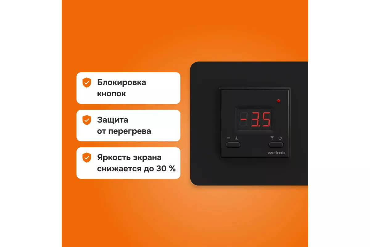 Терморегулятор имеет встроенную защиту от перегрева: при достижении температуры внутри корпуса 85 °C устройство автоматически отключает обогрев и возобновляет работу после снижения температуры до 80 °C.Также предусмотрена функция блокировки кнопок для предотвращения случайных изменений настроек.​
