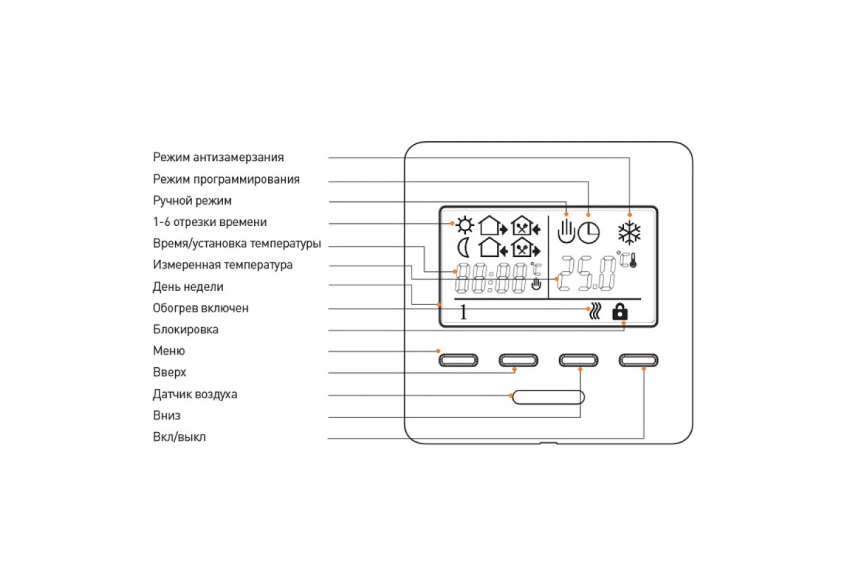 Устройство поддерживает программирование температурных режимов на каждый день недели, позволяя настроить комфортный климат в соответствии с вашим расписанием.