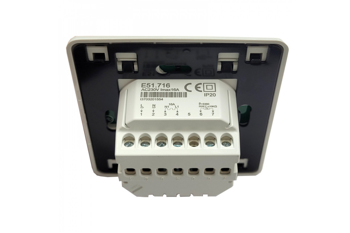 E 51.716 оснащён двумя датчиками: встроенным для измерения температуры воздуха и выносным для контроля температуры пола. Это обеспечивает более точное и гибкое управление системой обогрева.