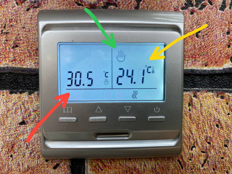 На дисплее есть отображение температуры пола фактической и заданной. Время и индикация режима работы, ручной или автоматический.
