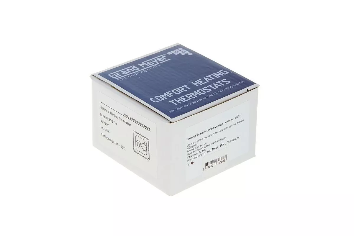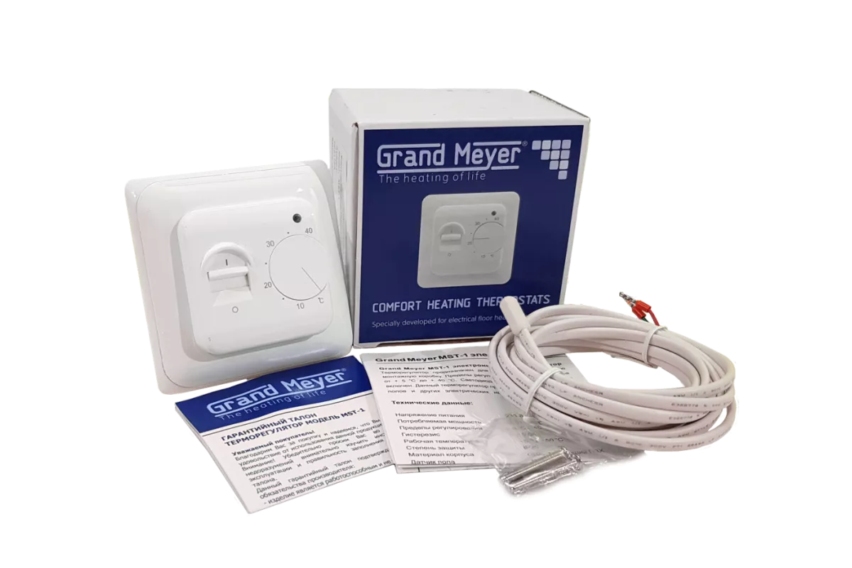 Grand Meyer MST-1 предназначен для управления нагревом электрических теплых полов. Позволяет управлять температурой пола в диапазоне от +5 до +40°С с шагом в 5°С. Также на передней панели расположен сетевой кнопочный выключатель для автономного отключения терморегулятора.